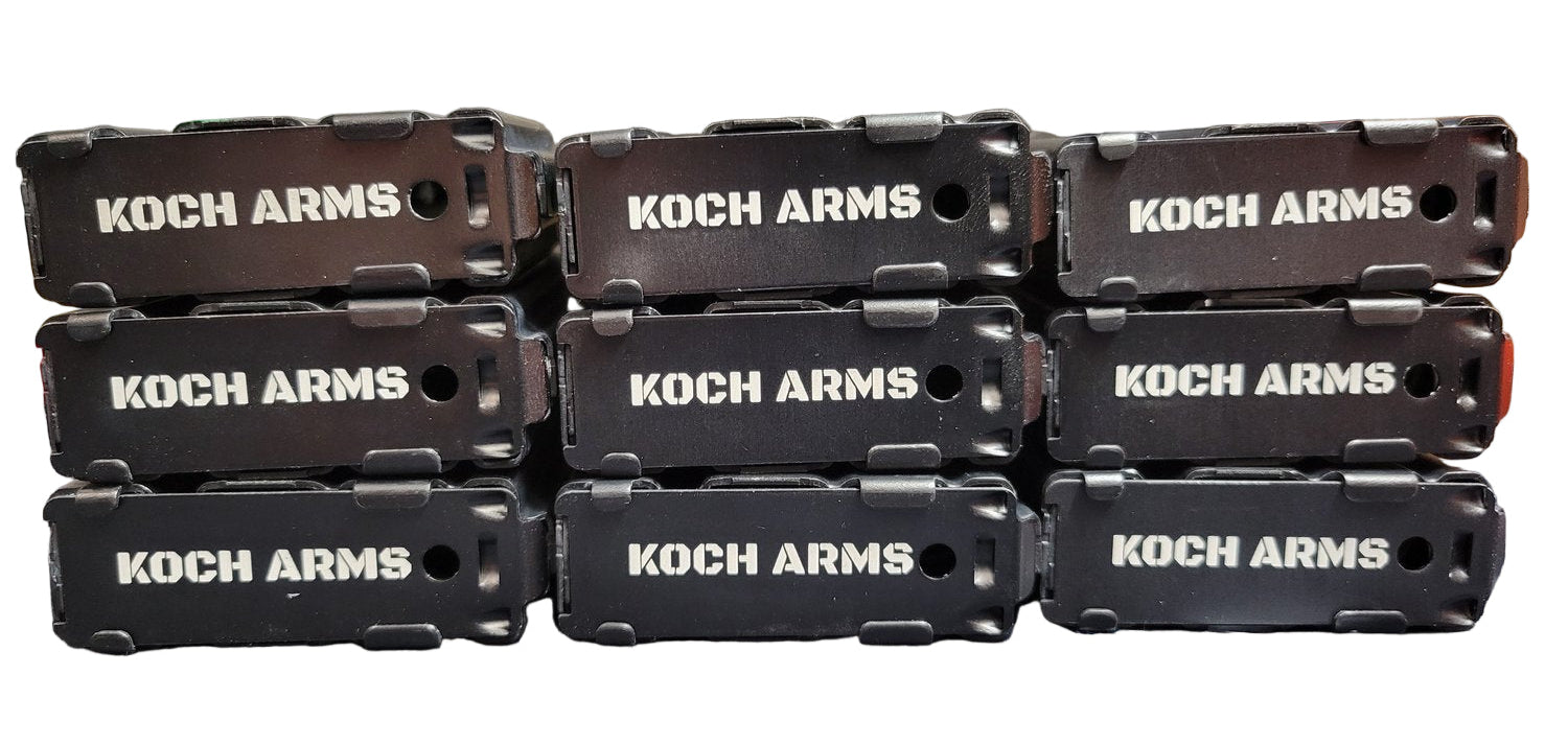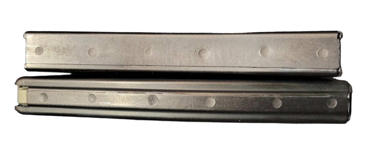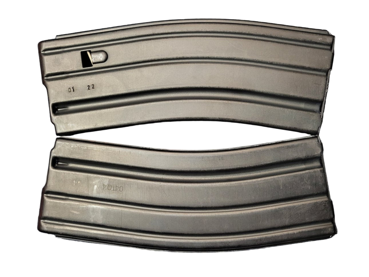 We metal stamp magazines from aircraft grade aluminum or premium steel on large tonnage mechanical presses, progressive form and then fuse with spot welding automation. Each and every magazine is 100% checked for key critical characteristics. Destructive tests are periodically performed to verify weld adhesion. Magazines are then heat-treated and hard coat anodized for maximum wear resistance. A 17-7PH spring tested for spring “set” and compression values guides a precision ammunition follower. Finished magazines are selectively test fired with fully automatic weapons to ensure no failure of feed or other magazine related issues. These tests are often conducted by military inspectors.